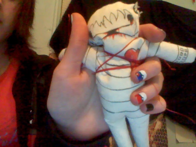 -Cortar un trozo de tus uñas y ponerlo dentro del muñeco, y coser la abertura con el hilo carmesÃ. Cuando termines, amarra al muñeco con el resto del hilo (El hilo rojo representa un envase de sangre, sella al espÃritu dentro del muñeco).