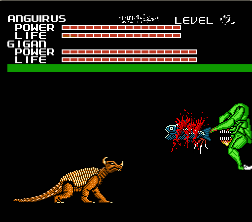 El falso Gigan era duro, pero mis nuevas habilidades con Anguirus ayudaron a igualar el marcador. ¡Era una lucha increíblemente tensa! Los ataques del falso Gigan consistían en una especie de láser de sangre que escupía por su boca, y un ataque hacia abajo. Yo esperaba alguna variante demoníaca del ataque de sierra circular, pero por suerte no hubo.