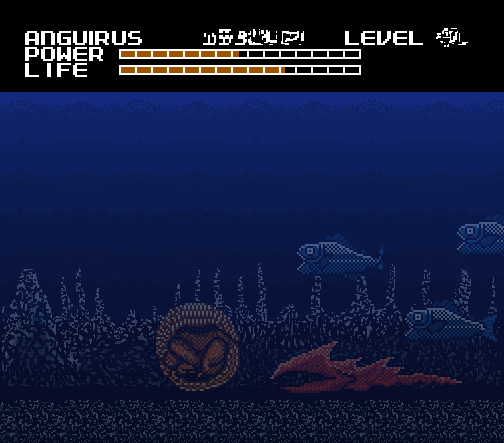 No había dónde ir más que al agua, así que me zambullí. La transparencia del agua hacia las cosas un poco más difíciles de ver, pero era tolerable. Después de meterme en el agua me encontré con 2 nuevos enemigos: una piraña gigante y una especie de alimaña pinchuda de las profundidades. Me gustó la piraña porque yo podía fácilmente decir lo que era. Era un diseño de enemigo normal que podría aparecer en cualquier juego, y había muy pocos enemigos de este tipo.