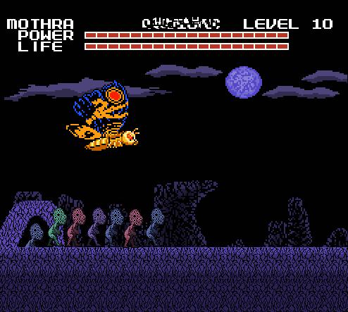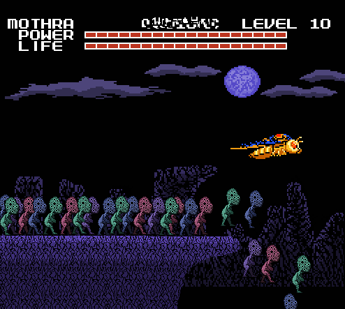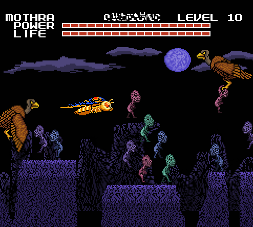 Había otro grupo de "cabezones" multicolores brincando, que fueron arrebatados por aves de gran tamaño, que estoy seguro de que son versiones sprite del Cóndor Gigante de "Godzilla vs El Monstruo Marino".