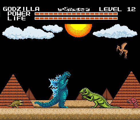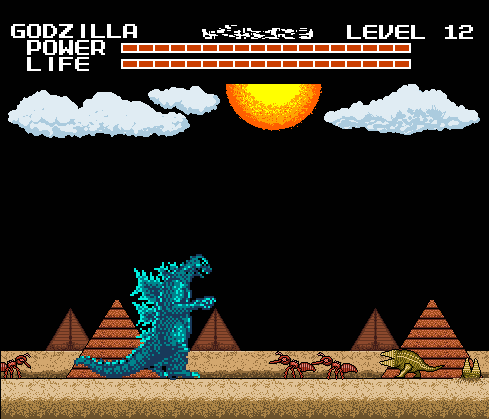 En el siguiente nivel que jugué era uno al que yo llamo "Pirámides de bronce". Usaba a Godzilla, y descubrà que haba sido llevado hasta el nivel 12 ya que jugué con el en "Demencia".