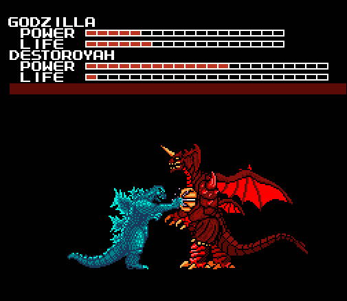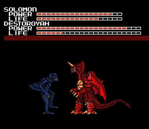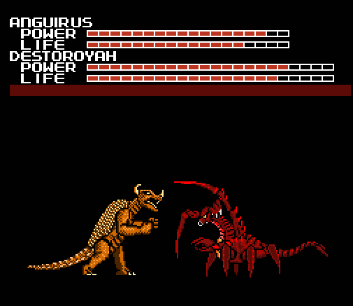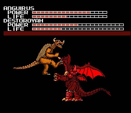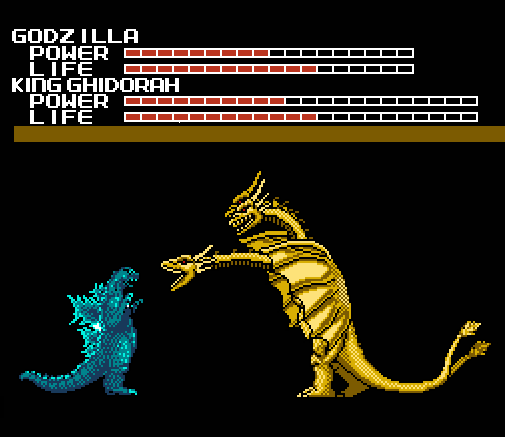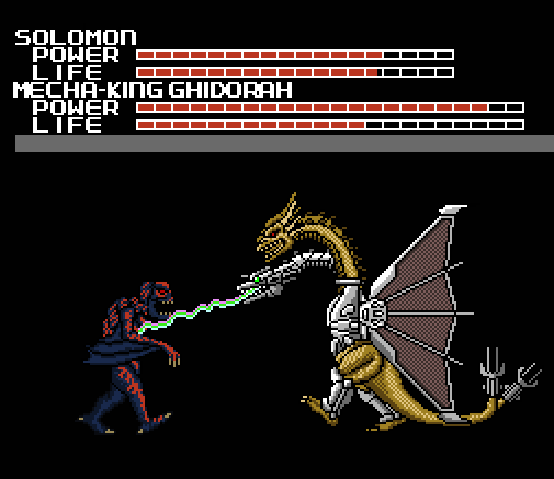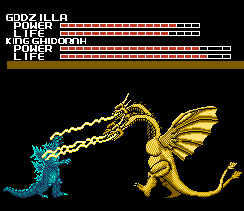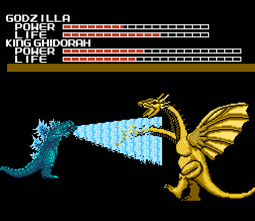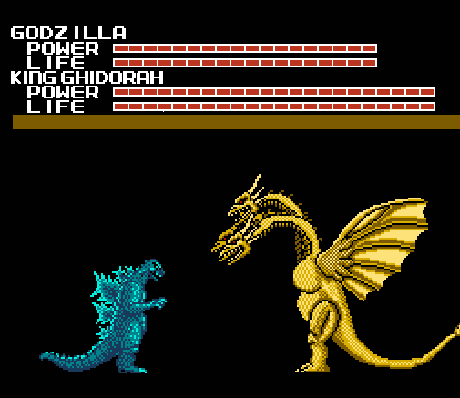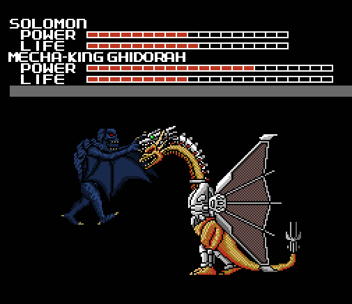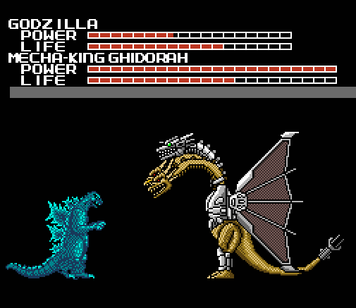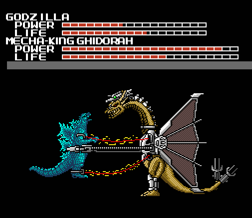 El Rey Ghidorah ultilizó el poder del glitch para transformarse en Mecha Rey Ghidorah. Pero lo que realmente me sorprendió fue el cambio repentino de la música. Pero no era música de un juego de la NES. La había escuchado antes en el juego de Super Godzilla durante la batalla de Mecha Rey Ghidorah.